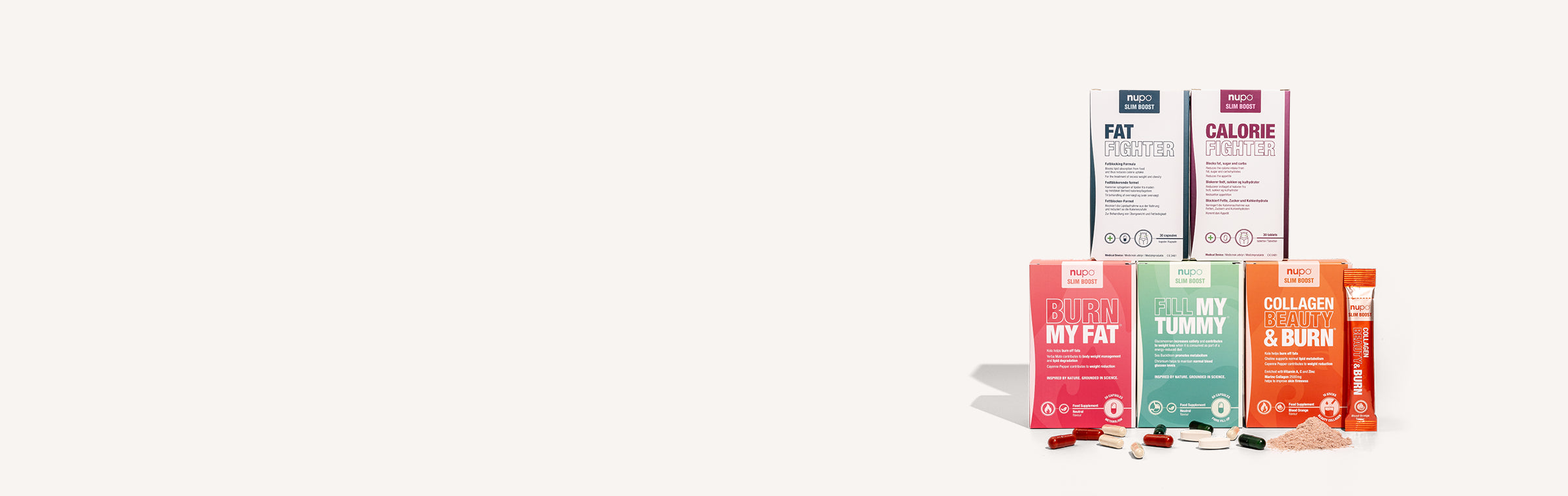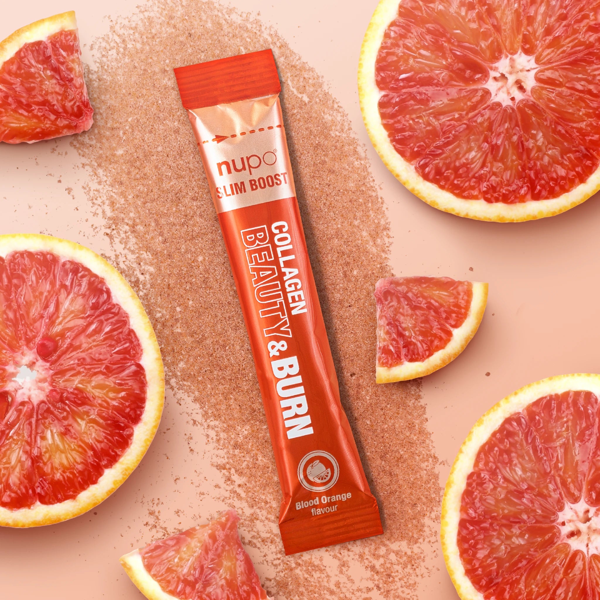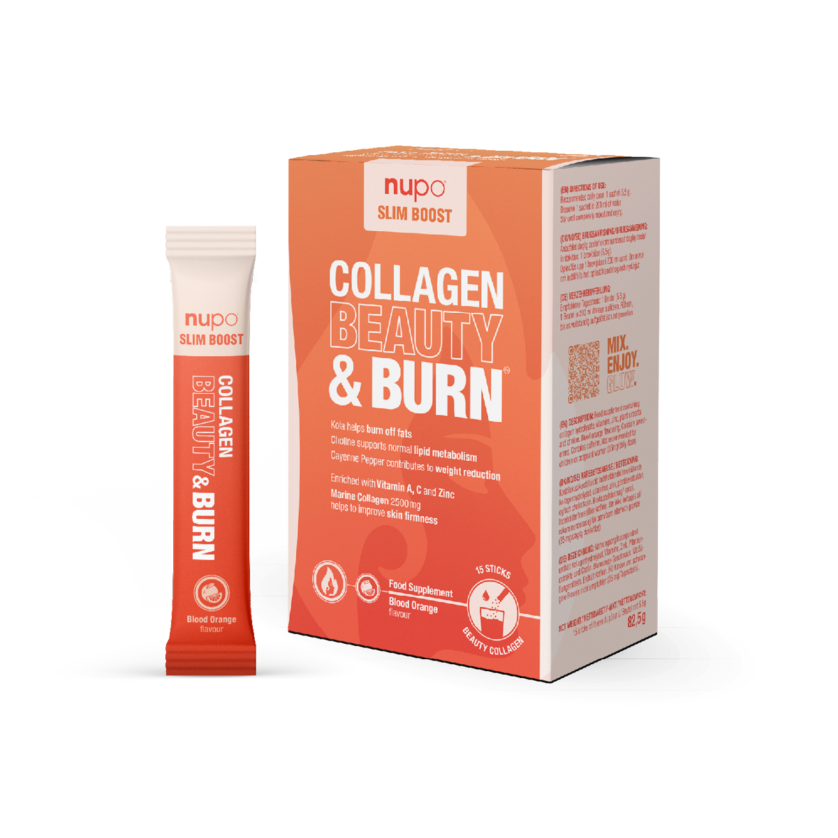 NUPO SLIM BOOST Collagen Beauty & Burn je účinná směs vitamínů, minerálů a rostlinných extraktů. Užíváním NUPO Slim Boost Collagen Beauty & Burn, kde jsme zkombinovali mořský kolagen a spalovač tuků, podpoříte hubnutí díky rostlinným extraktům, jako je ořech Kola, Guarana a kajenský pepř. Navíc získáte 2500 mg mořského kolagenu, který podporuje pružnost a hydrataci pokožky.