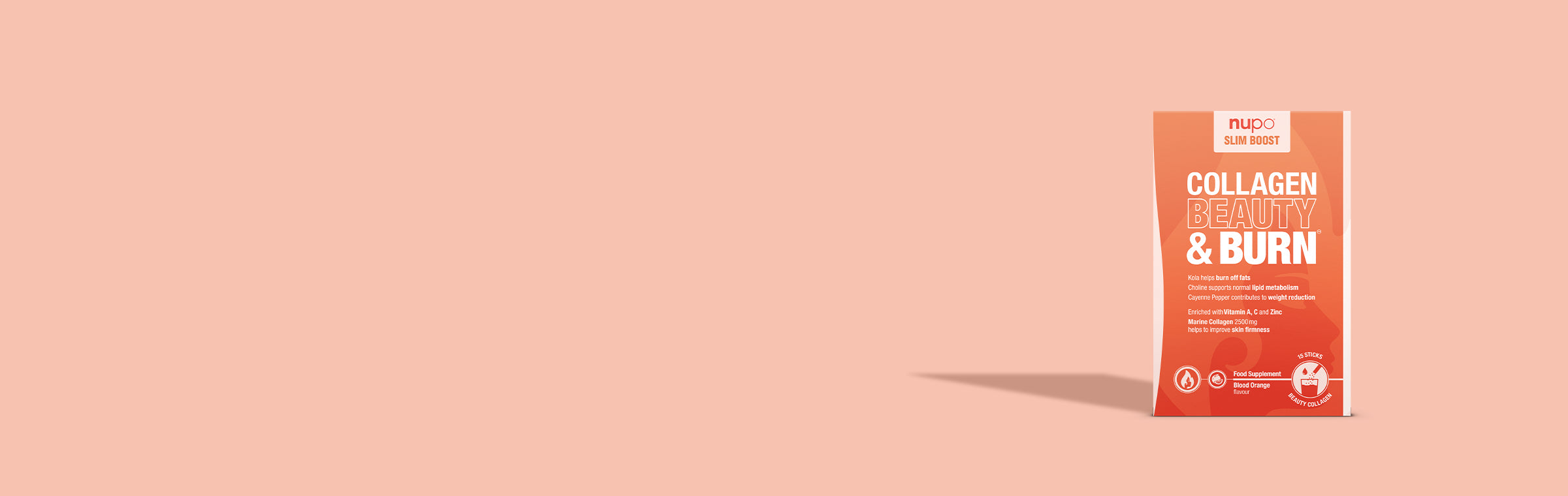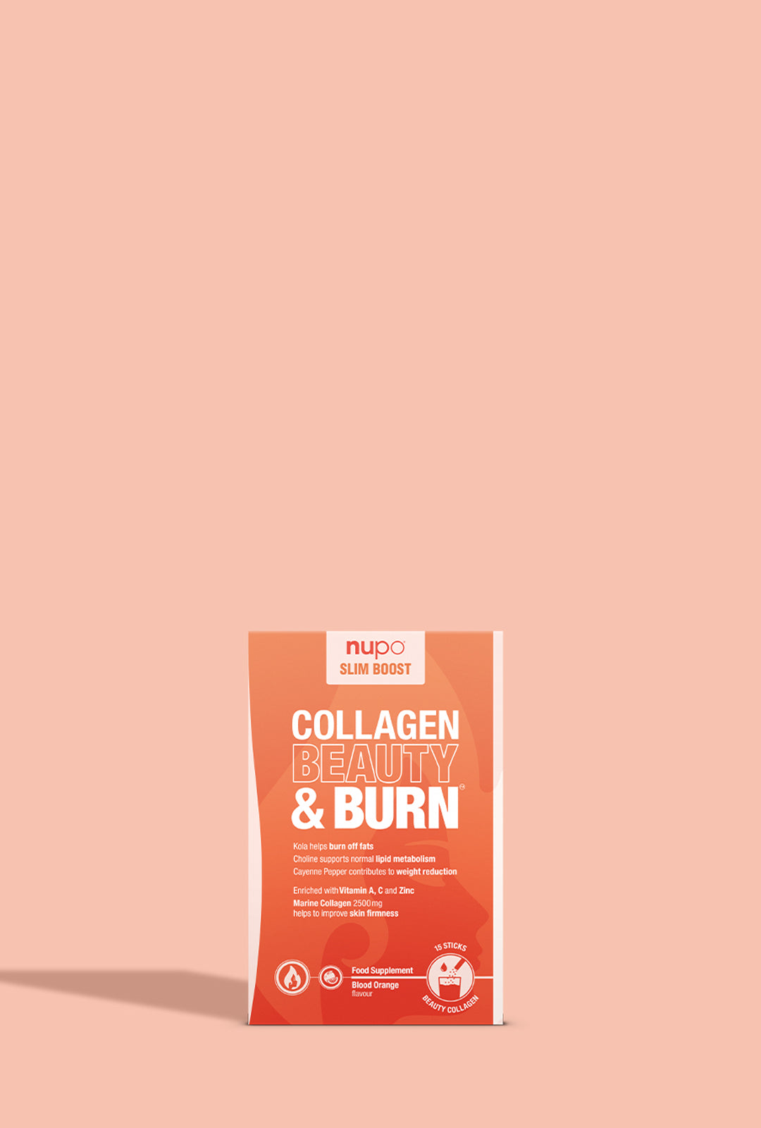 NUPO Slim Boost Collagen Beauty & Burn je účinná kompozice pečlivě vybraných rostlinných extraktů v kombinaci s vitamíny, minerály a kolagenem z mořských zdrojů. Zrychluje metabolismus a zároveň obsahuje kolagen: TYP I (97 %) na podporu kůže, šlach a kostí + TYP III (3 %) – pro optimální podporu pokožky