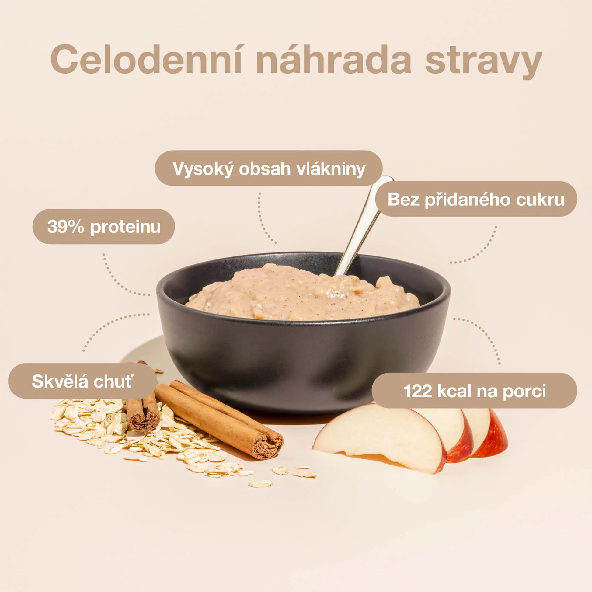 SOJOVÝ protein, OVESNÉ vločky (24 %), vláknina (8,5 %) (OVESNÁ vláknina [bez lepku], rozpustná kukuřičná vláknina, částečně hydrolyzovaná guarová guma [Sunfiber®], prášek ze slupek psyllia), minerály (draslík, chlorid, vápník, fosfor, magnesium, zinek, železo, mangan, měď, jód, selen, molybden) a vitaminy (vitamin C, niacin, vitamin E, kyselina pantothenová, riboflavin, vitamin B6, thiamin, vitamin A, kyselina listová, vitamin K, biotin, vitamin D, vitamin B12), rostlinný olej (řepkový, sójový), SOJOVÝ lecitin, sušené kousky jablek (2 %), aroma, skořice (1,3 %), MLÉČNÝ protein, cholin bitartrát, sladidlo: sukralóza (E955).