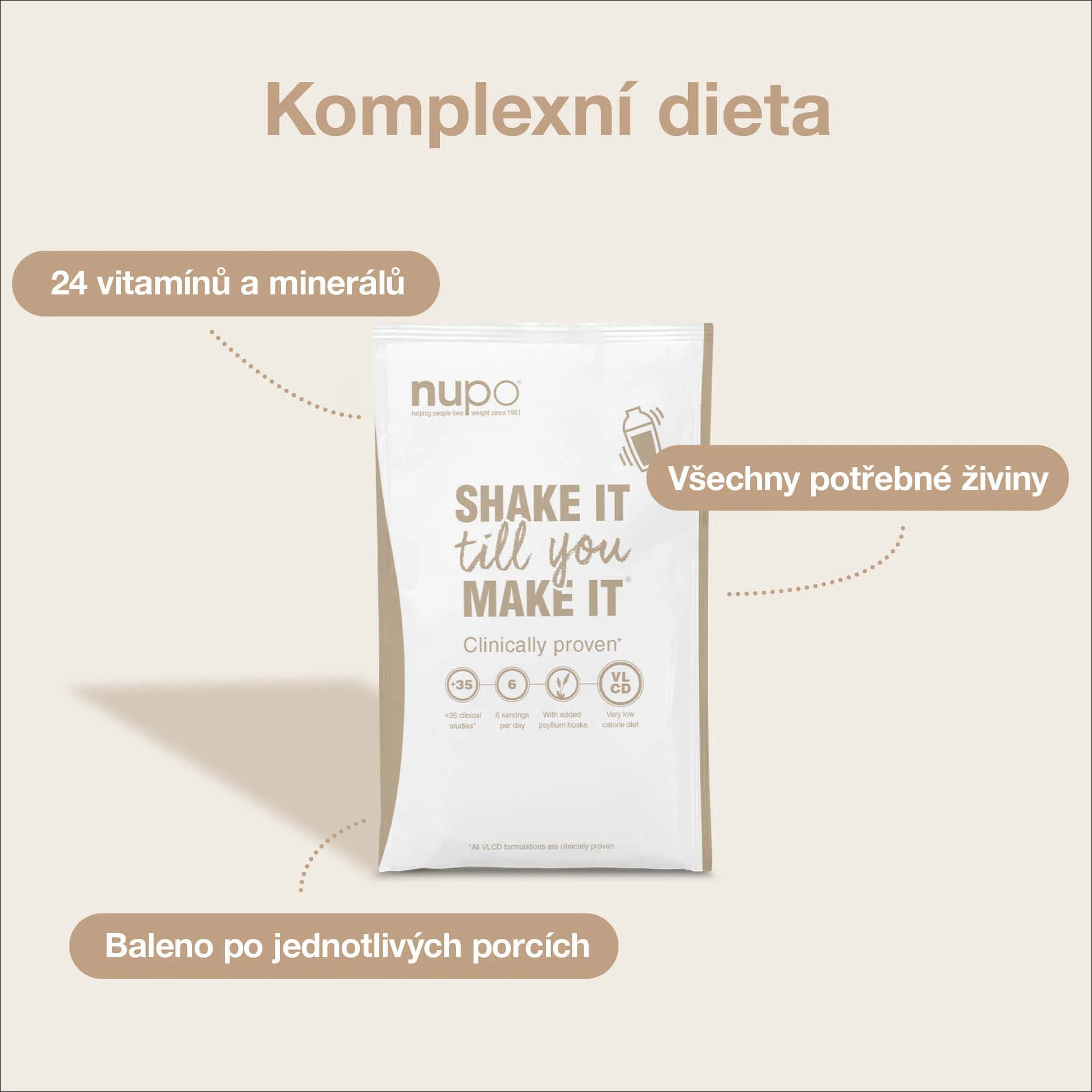 NUPO je nízkokalorický program pro redukci hmotnosti, který vás rychle a zdravě dostane do skvělé formy. Tato dánská dieta obsahuje všechny složky vyvážené stravy (bílkoviny, sacharidy, vitamíny a minerály) namíchané tak, abyste efektivně zhubli a nedostavil se jojo efekt. Díky jeho skvělé chuti nestrádají ani vaše chuťové buňky a vysoký obsah vlákniny zase zabraňuje pocitu hladu, který byste při šesti porcích denně mít neměli. S NUPEM nemusíte nic vážit či počítat kalorie. Vše je již připraveno. NUPO je baleno po jednotlivých porcích, umožňuje vám tedy vzít si ho pohodlně kamkoli s sebou. K jeho přípravě potřebujete pouze šejkr a vodu.
