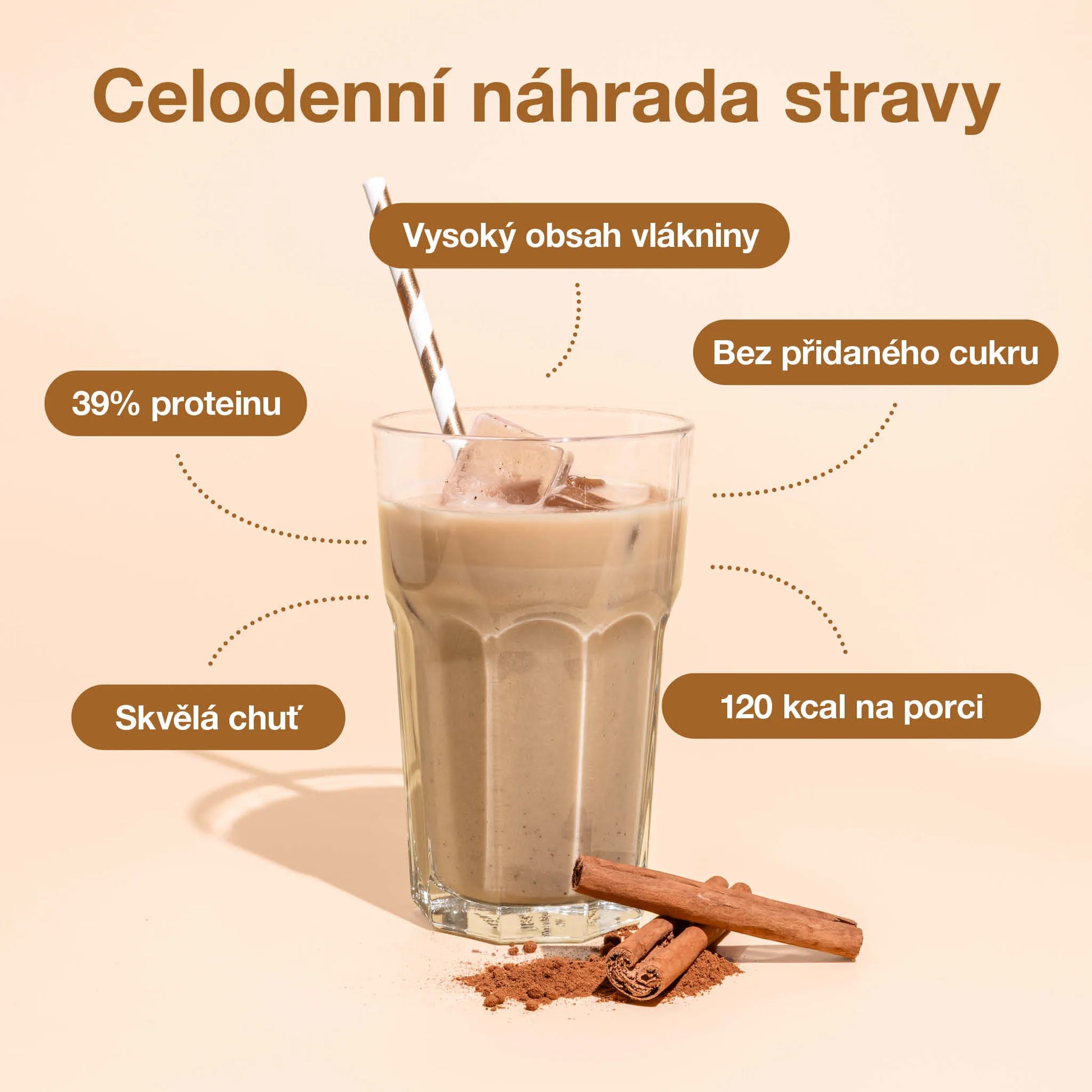 SOJOVÝ protein, maltodextrin, vláknina (10 %) (OVESNÁ vláknina [bez lepku], rozpustná kukuřičná vláknina, částečně hydrolyzovaná guarová guma [Sunfiber®], prášek ze slupek psyllia), minerály (draslík, chlorid, vápník, fosfor, hořčík, zinek, železo, mangan, měď, jód, selen, molybden) a vitaminy (vitamin C, niacin, vitamin E, kyselina pantothenová, riboflavin, vitamin B6, thiamin, vitamin A, kyselina listová, vitamin K, biotin, vitamin D, vitamin B12), rostlinný olej (sojový, řepkový), SOJOVÝ lecitin, MLÉČNÝ protein, aroma, skořice (1 %), kardamom (0,8 %), barvivo: karamel s amoniakem (E150c); modifikovaný škrob, cholin bitartrát, zahušťovadlo: celulózová guma (E466); sladidlo: sukralóza (E955).