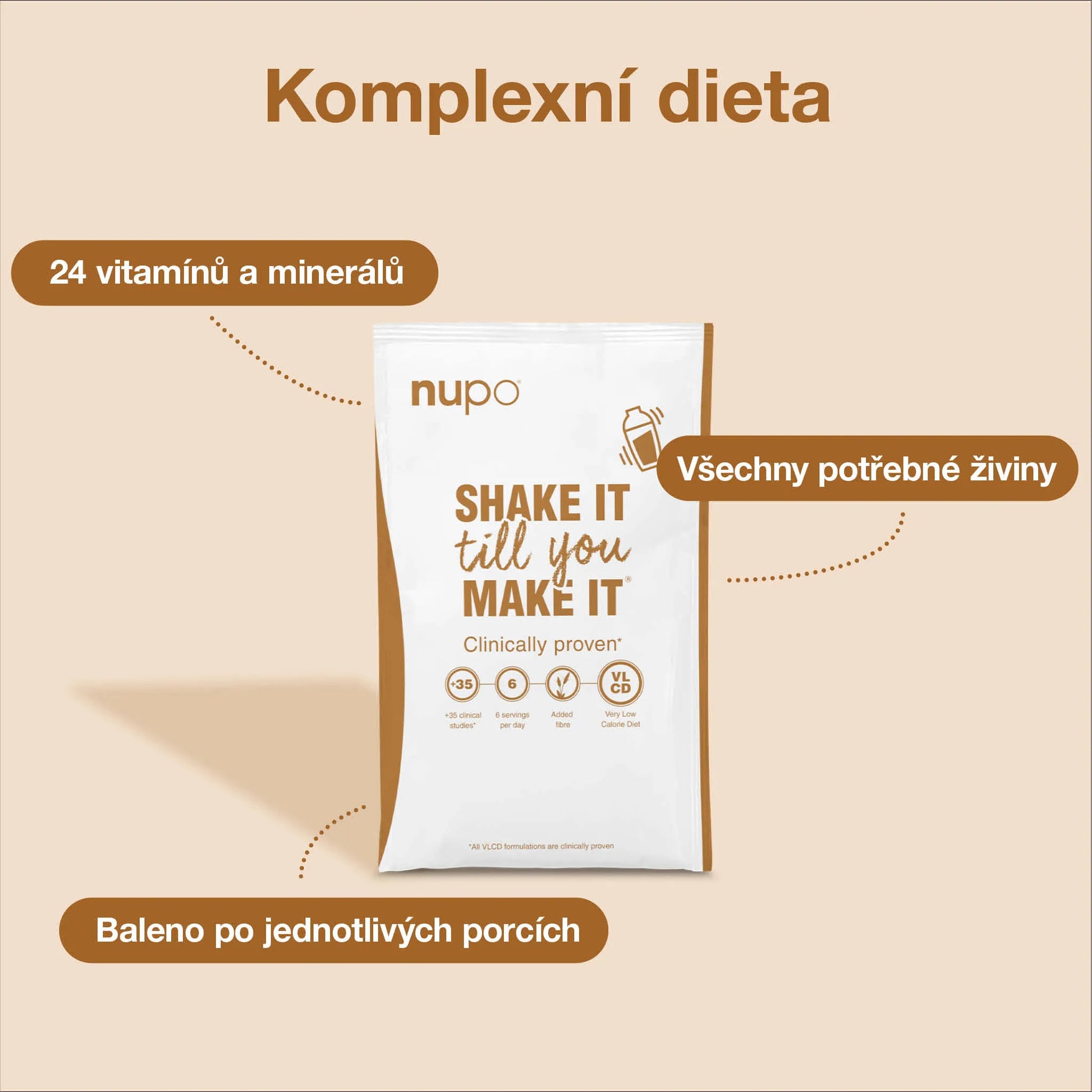 NUPO je nízkokalorický program pro redukci hmotnosti, který vás rychle a zdravě dostane do skvělé formy. Tato dánská dieta obsahuje všechny složky vyvážené stravy (bílkoviny, sacharidy, vitamíny a minerály) namíchané tak, abyste efektivně zhubli a nedostavil se jojo efekt. Díky jeho skvělé chuti nestrádají ani vaše chuťové buňky a vysoký obsah vlákniny zase zabraňuje pocitu hladu, který byste při šesti porcích denně mít neměli. S NUPEM nemusíte nic vážit či počítat kalorie. Vše je již připraveno. NUPO je baleno po jednotlivých porcích, umožňuje vám tedy vzít si ho pohodlně kamkoli s sebou. K jeho přípravě potřebujete pouze šejkr a vodu.