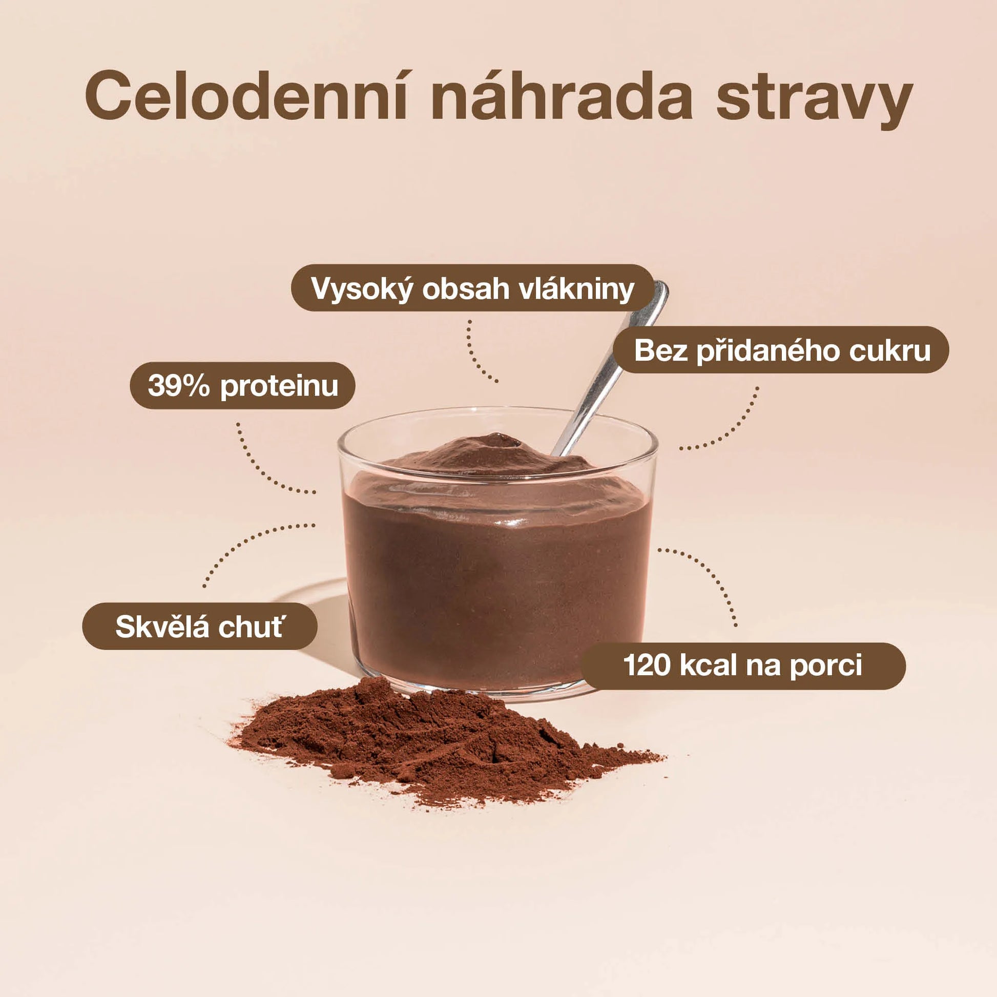 SOJOVÝ protein, kakao se sníženým obsahem tuku (15 %), modifikovaný škrob, plnotučné MLÉKO v prášku, minerály (draslík, vápník, chlorid, fosfor, zinek, železo, mangan, měď, jód, selen, molybden) a vitaminy (vitamin C, niacin, vitamin E, kyselina pantothenová, riboflavin, vitamin B6, thiamin, vitamin A, kyselina listová, vitamin K, biotin, vitamin D, vitamin B12), rostlinný olej (řepkový, SOJOVÝ), vláknina (4,5 %) (OVESNÁ vláknina [bez lepku], rozpustná kukuřičná vláknina, částečně hydrolyzovaná guarová guma [Sunfiber®], prášek ze slupek psyllia), aroma, SOJOVÝ lecitin, maltodextrin, MLÉČNÝ protein, zahušťovadla: xanthanová guma (E415), celulózová guma (E466); cholin bitartrát, sladidlo: sukralóza (E955).