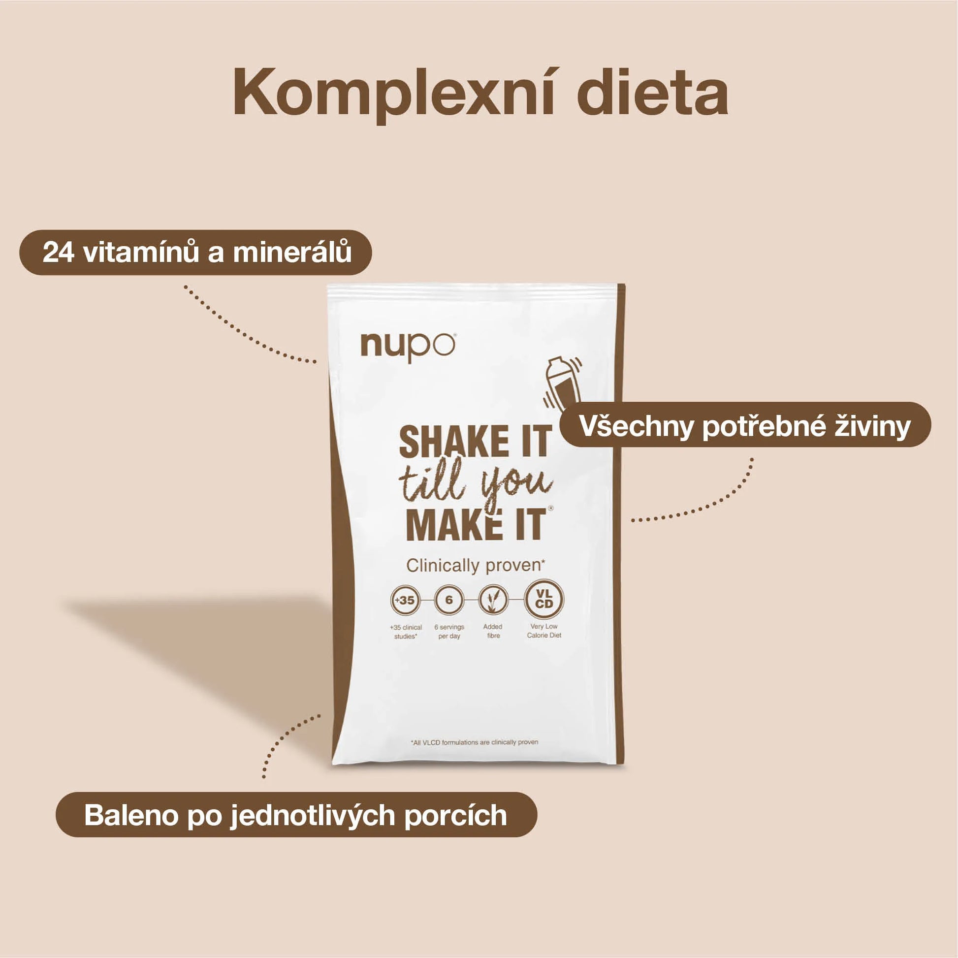 NUPO je nízkokalorický program pro redukci hmotnosti, který vás rychle a zdravě dostane do skvělé formy. Tato dánská dieta obsahuje všechny složky vyvážené stravy (bílkoviny, sacharidy, vitamíny a minerály) namíchané tak, abyste efektivně zhubli a nedostavil se jojo efekt. Díky jeho skvělé chuti nestrádají ani vaše chuťové buňky a vysoký obsah vlákniny zase zabraňuje pocitu hladu, který byste při šesti porcích denně mít neměli. S NUPEM nemusíte nic vážit či počítat kalorie. Vše je již připraveno. NUPO je baleno po jednotlivých porcích, umožňuje vám tedy vzít si ho pohodlně kamkoli s sebou. K jeho přípravě potřebujete pouze šejkr a vodu. Obsahuje sladidla. Obsahuje méně než 20 ppm lepku.