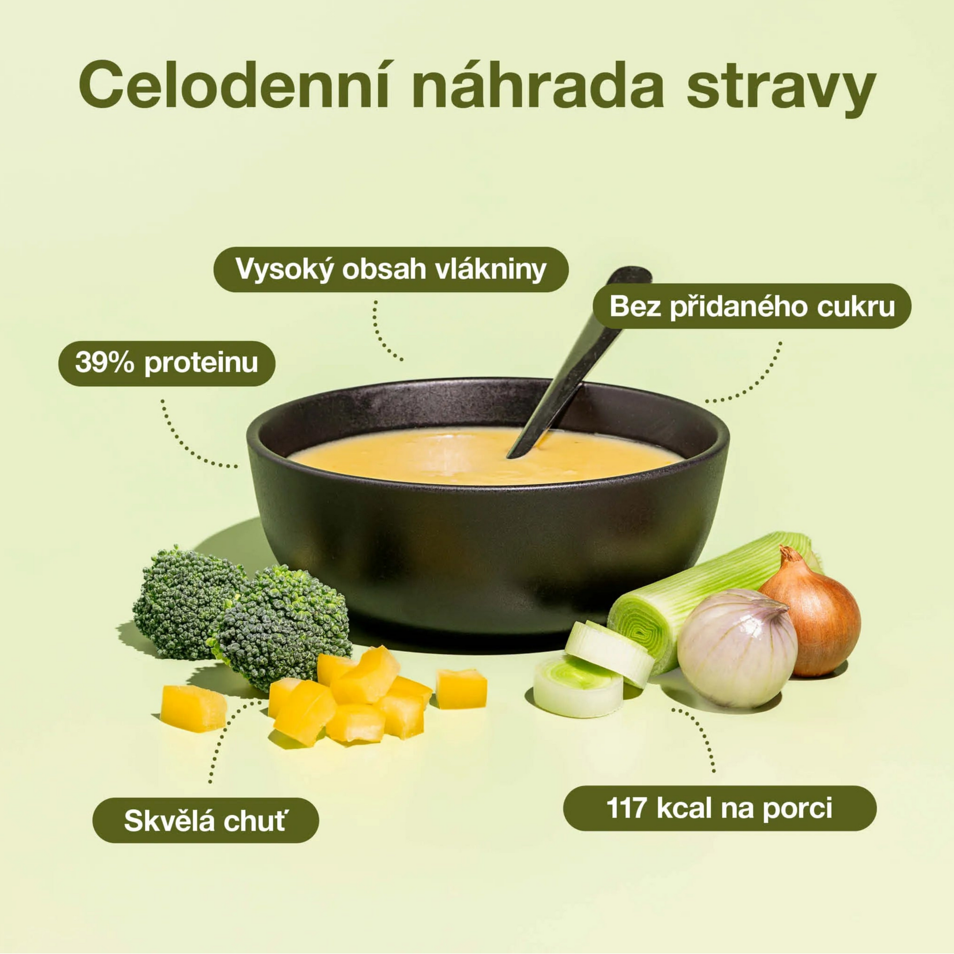SOJOVÝ protein, vláknina (9 %) (OVESNÁ vláknina [bez lepku], rozpustná kukuřičná vláknina, částečně hydrolyzovaná guarová guma [Sunfiber®], prášek ze slupek psyllia), modifikovaný škrob, rostlinný olej (sójový, řepkový), minerály (draslík, chlorid, vápník, fosfor, hořčík, zinek, železo, mangan, měď, jód, selen, molybden) a vitaminy (vitamin C, niacin, vitamin E, kyselina pantothenová, riboflavin, vitamin B6, thiamin, vitamin A, kyselina listová, vitamin K, biotin, vitamin D, vitamin B12), maltodextrin, aroma, SOJOVÝ lecitin, cibulový prášek (4 %), MLÉČNÝ protein, zahušťovadlo: celulózová guma (E466); sůl, cholin bitartrát, brokolice (0,4 %), paprika (0,4 %), pórek (0,3 %), barvivo: karoteny (E160a).