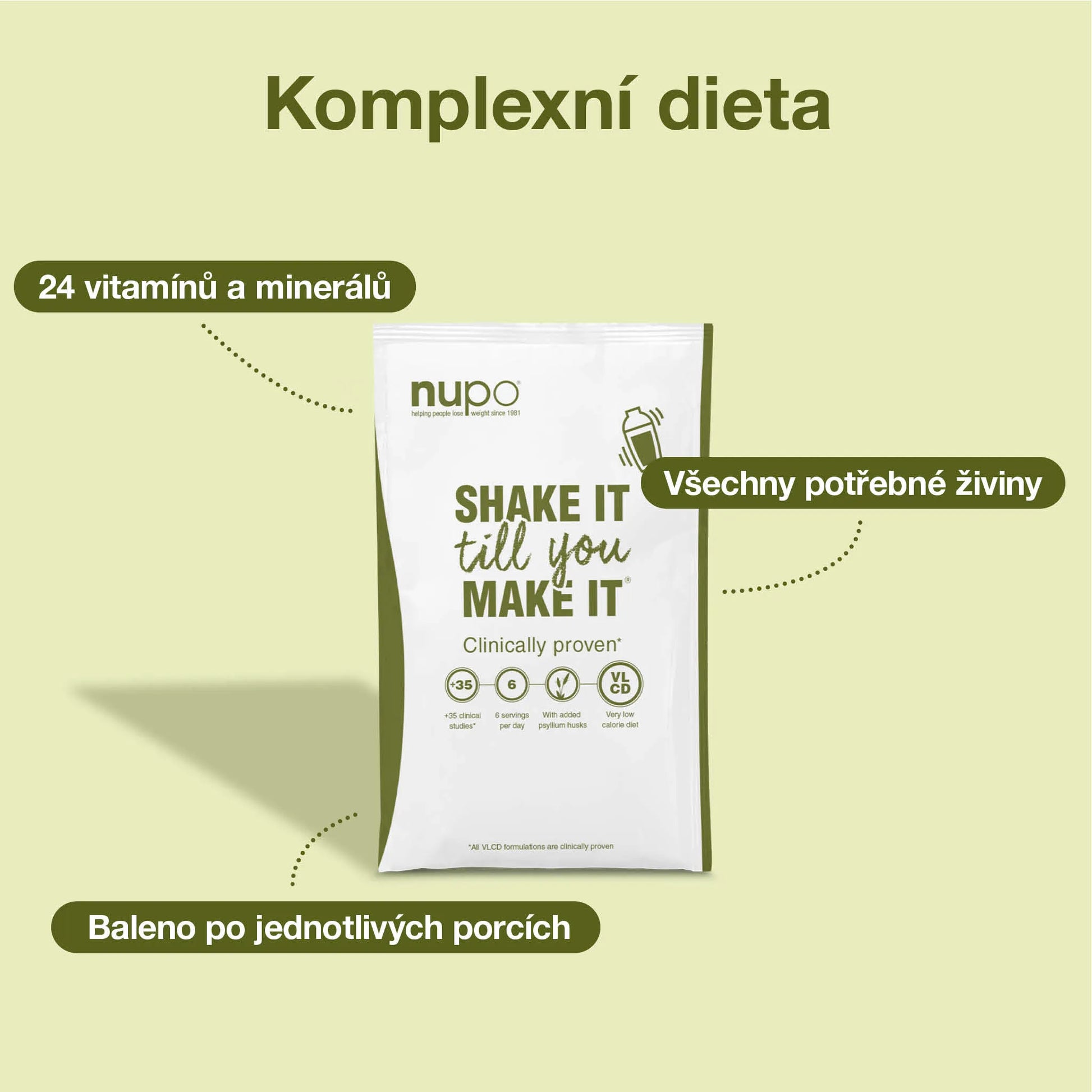 NUPO je nízkokalorický program pro redukci hmotnosti, který vás rychle a zdravě dostane do skvělé formy. Tato dánská dieta obsahuje všechny složky vyvážené stravy (bílkoviny, sacharidy, vitamíny a minerály) namíchané tak, abyste efektivně zhubli a nedostavil se jojo efekt. Díky jeho skvělé chuti nestrádají ani vaše chuťové buňky a vysoký obsah vlákniny zase zabraňuje pocitu hladu, který byste při šesti porcích denně mít neměli. S NUPEM nemusíte nic vážit či počítat kalorie. Vše je již připraveno. NUPO je baleno po jednotlivých porcích, umožňuje vám tedy vzít si ho pohodlně kamkoli s sebou. K jeho přípravě potřebujete pouze šejkr a vodu.